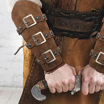 Faux Leather Long Arm Cuff with Buckles and Nail Heads Brown