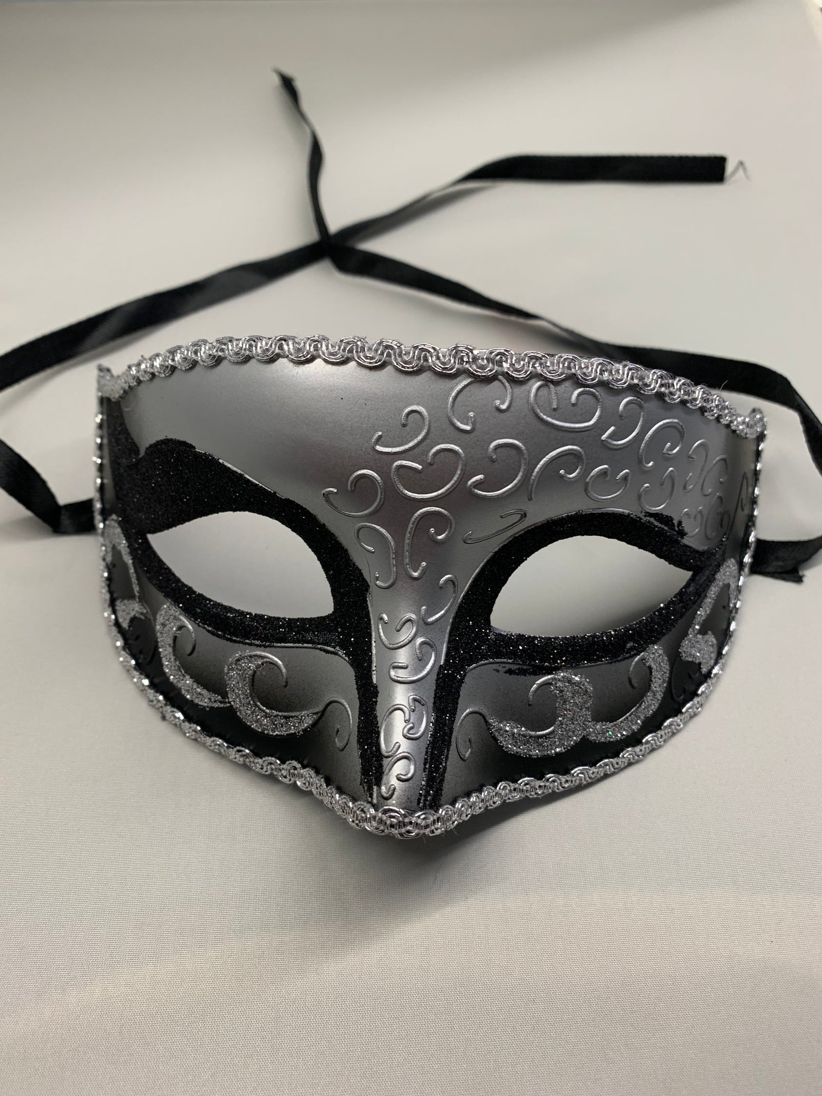 Black & Silver Half Mask with Glitter & Ribbon Ties