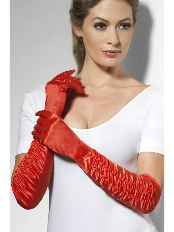 Elbow Length Ruched Gloves - Red