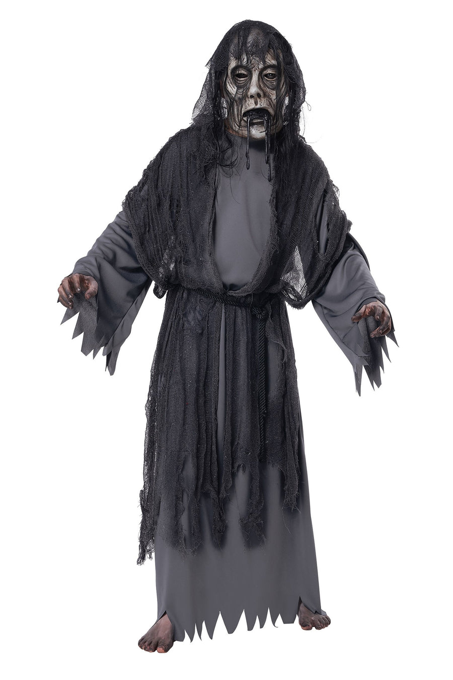 Something sinister haunts the old cemetery. The Ghoul In the Graveyard child costume is gray robe and a mesh over layer with attached hood. It comes with a cord waist tie and a Flexi-Lite mask with attached wig strands. Mask comes with 1 sticky stretch slime piece that can be attached. Flexi-Lite masks are flexible and lightweight.
