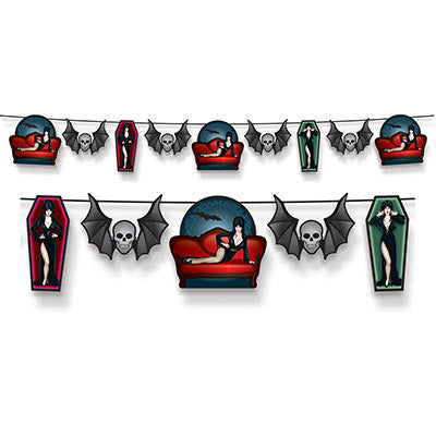 Officially licensed Elvira™ streamer decoration. Measures 6 3/4"  x 6'
