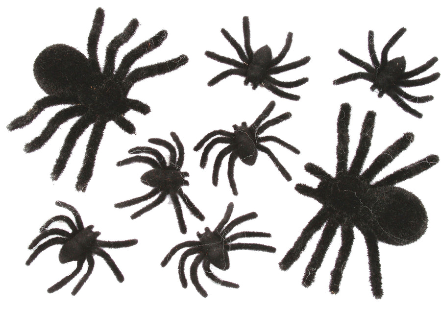 These realistic fuzzy black spiders are the perfect touch to make your Halloween decor extra icky! Just add a few webs and you have a great display! Eight-piece card contains 2 larger spiders and 6 smaller spiders. Arachnophobes beware!