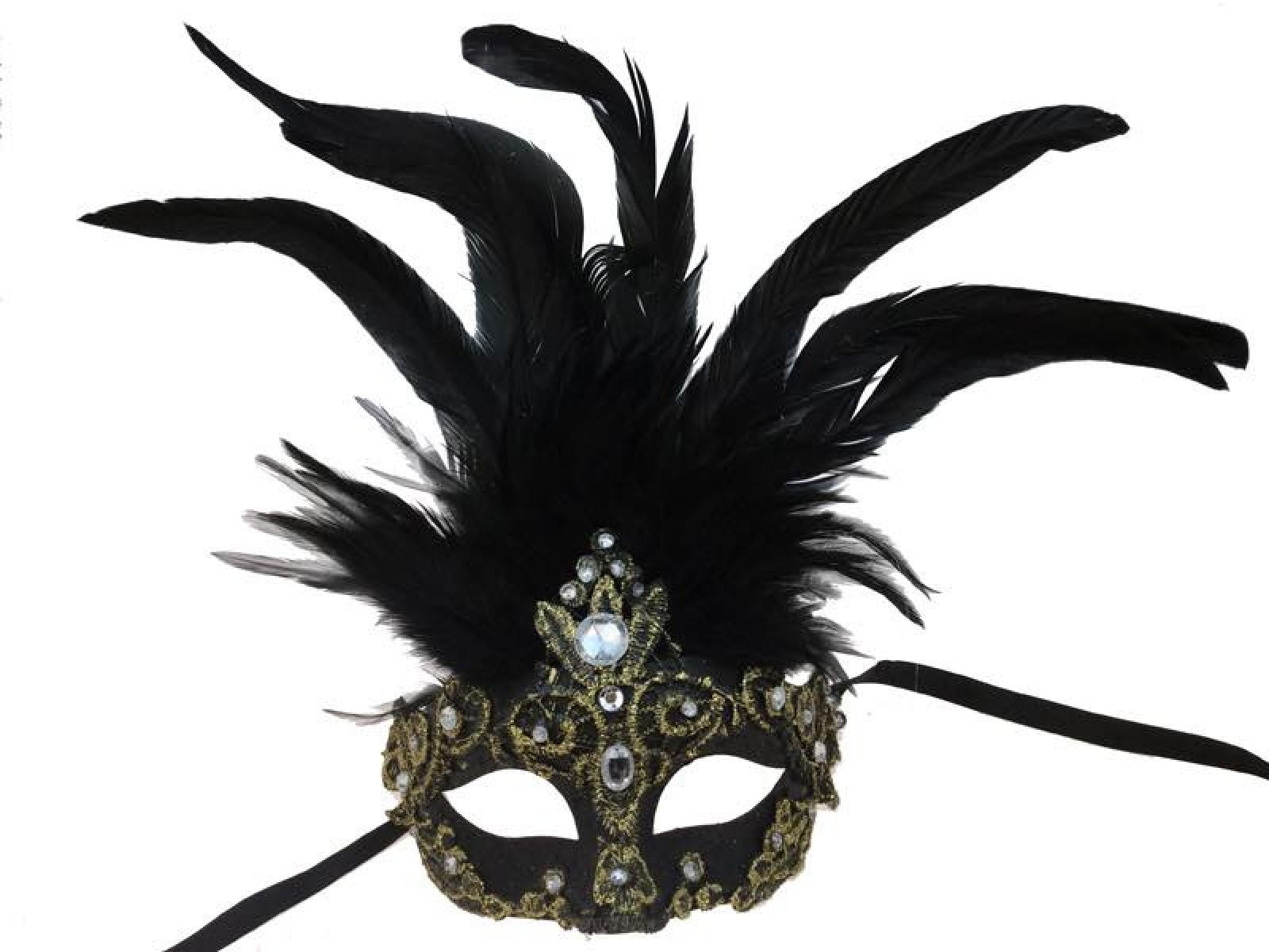Half Mask with Feathers & Clear Jewels - Black & Gold