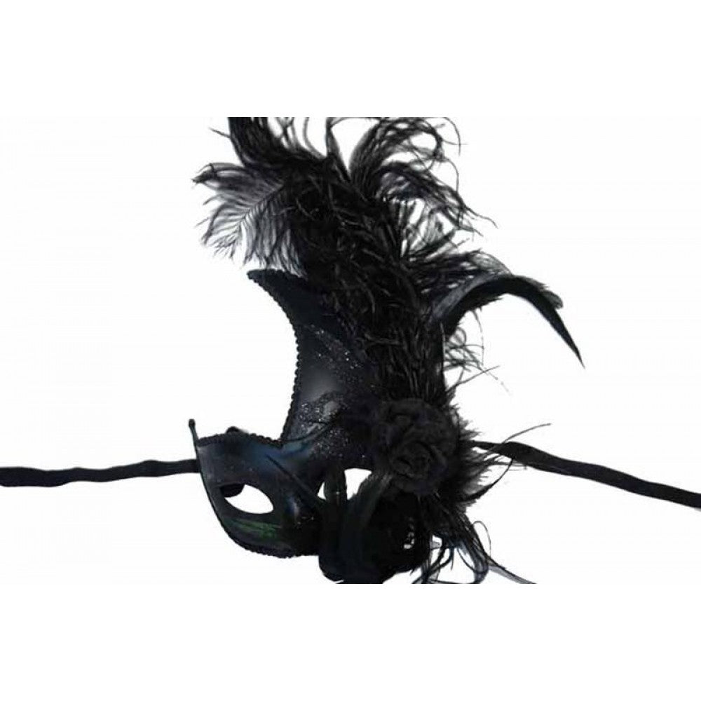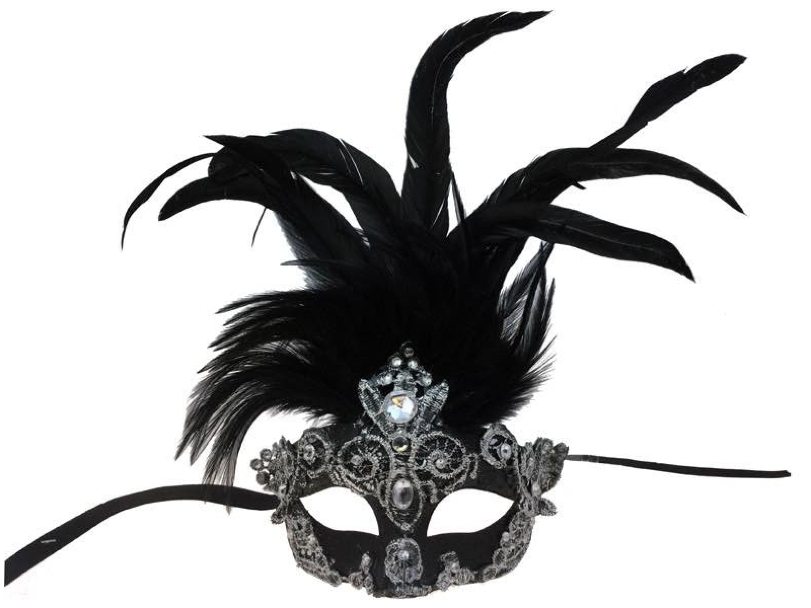 Black & SilverHalf Mask with Black Feathers on Stick