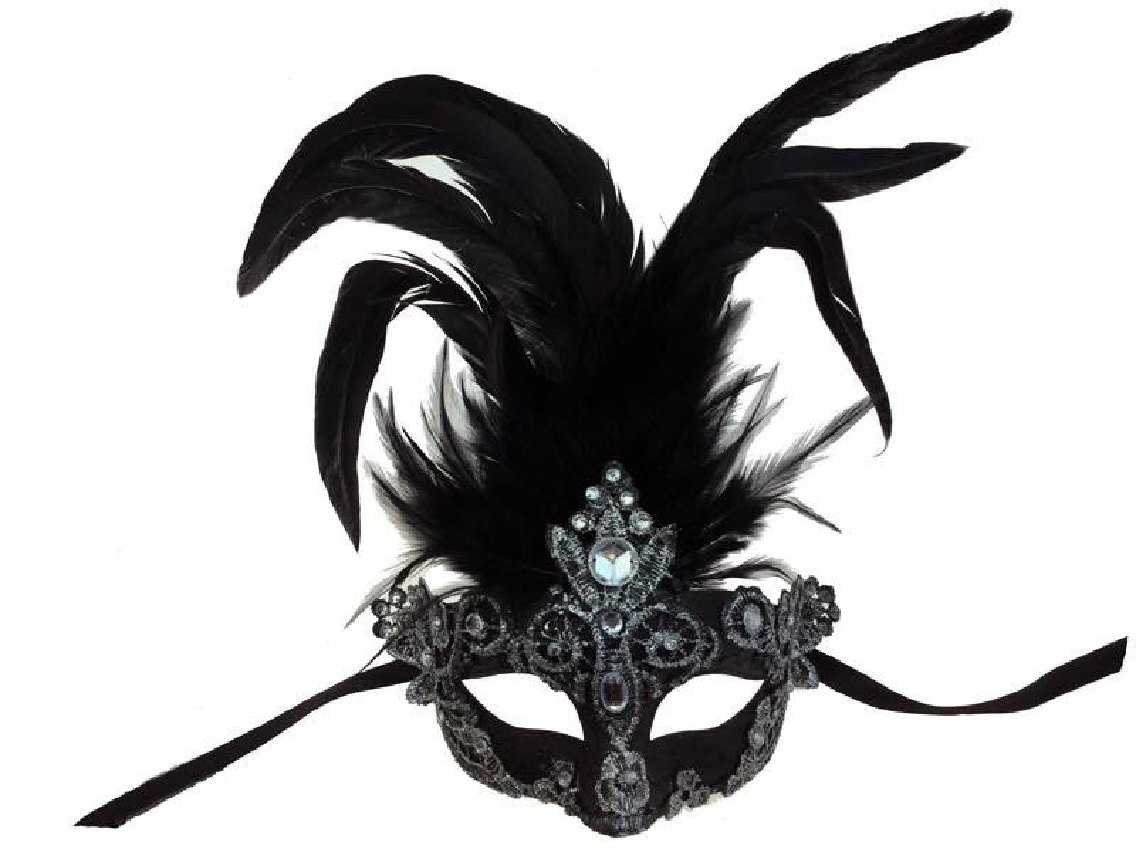 Half Mask with Feathers & Clear Jewels - Black & Silver