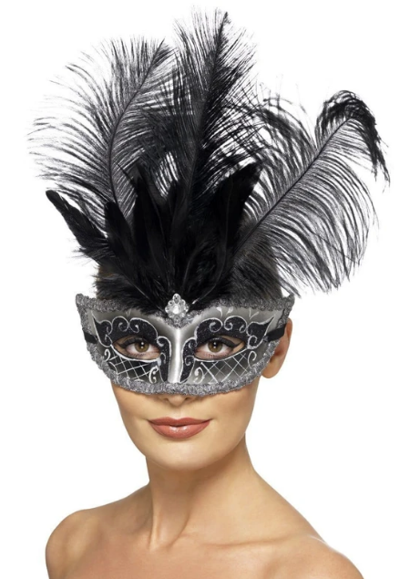 Black & Silver Half Mask with Glitter & Feathers