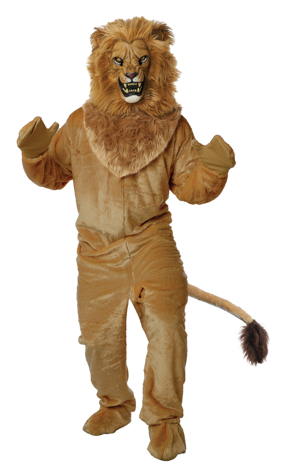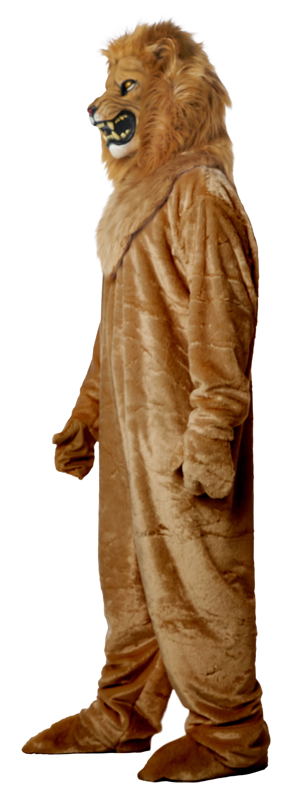 Product Description: Faux fur body suit with low pile plush. Features a mane "bib" attached to the front neck. Attached tail has an embedded wire to make it poseable. Closes in back, neck to waist, with two ties. Pair of mitts with plush on the outer "hand" and beige fabric palms. Pair of foot covers, open bottom with elastic mid sole strap and fabric toe hold. Lion motion mask, Mask moves with wearers own jaw motion. Mask is attached to a full faux fur hood. Moving mask section is made of a plastic inner skull and a polyurethane foam skin. When you open your jaw the skin stretches open, when jaw is relaxed the skin closes the jaw. Includes foam insets to customize fit and function. Large Mask, Dimensions: Width at Temple 7" 3/8th inches. Height 10" inches.