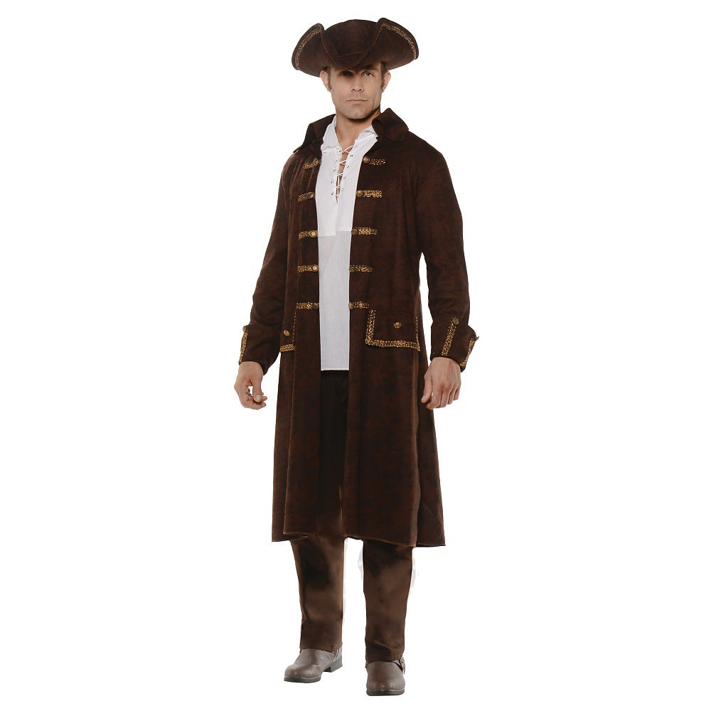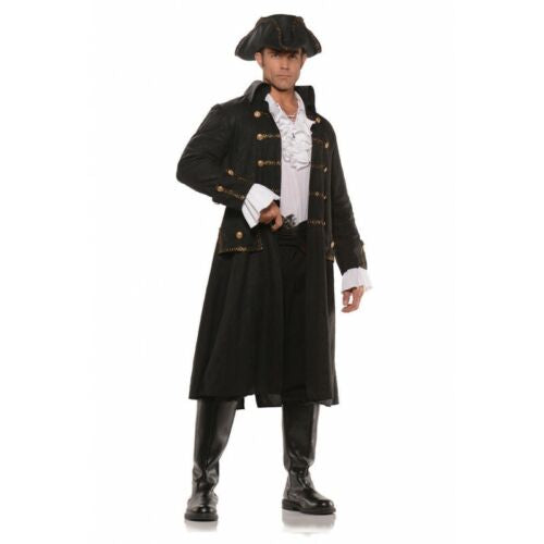 This deluxe pirate costume includes Faux leather print trimmed coat, ruffled front laced shirt, pants, sash, hat. Fantastic quality!