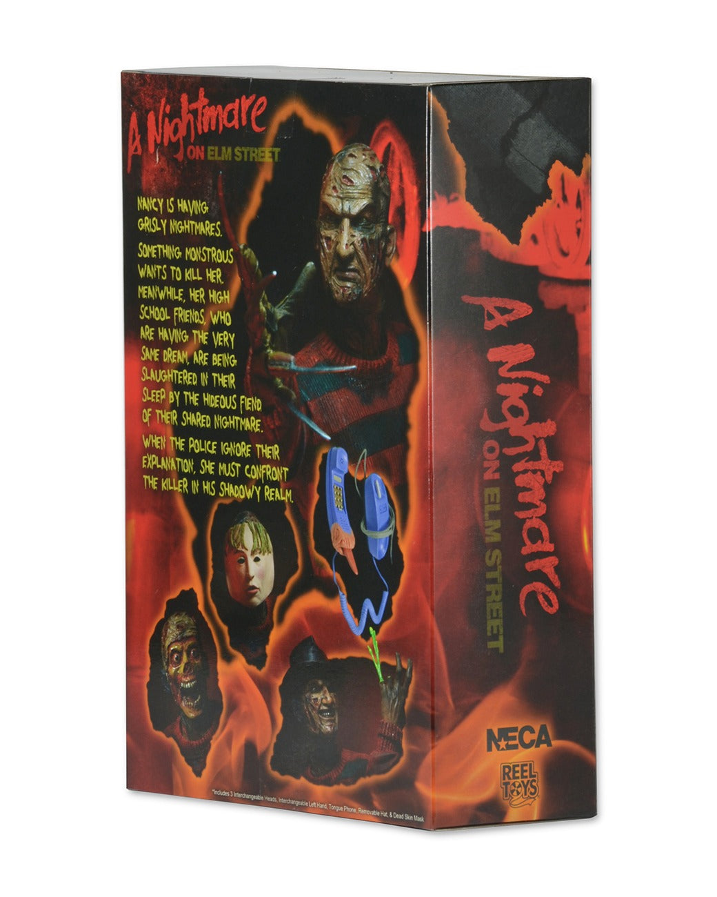 Freddy stands nearly 7" tall and features a fully articulated lower body featuring ball-hinged thighs and knees. The figure comes with three interchangeable heads, including closed mouth, open mouth grimace, and skull face. He features an interchangeable left hand with two fingers cut off and includes a dead skin mask, tongue phone, and his trusty fedora. Loaded with features, detail and articulation, this is the Freddy figure to own! Comes packaged in a collector-friendly window box packaging with opening flap.