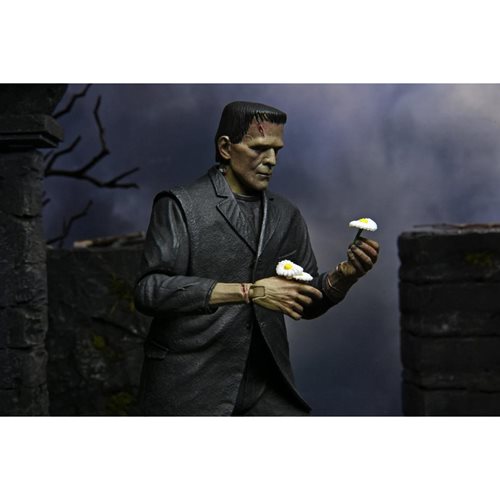 To celebrate the 90th anniversary of the acclaimed silver-screen classic Frankenstein, NECA announces the triumphant debut of Universal Monsters in its Ultimate action figure line! The sculpt captures Boris Karloff's poignant portrayal of the misunderstood monster in color. Standing in 7-inch scale, the figure comes in premium anniversary packaging with plenty of accessories: 3x interchangeable heads, 6x interchangeable hands, shackles, and daisies. AGES 17+.