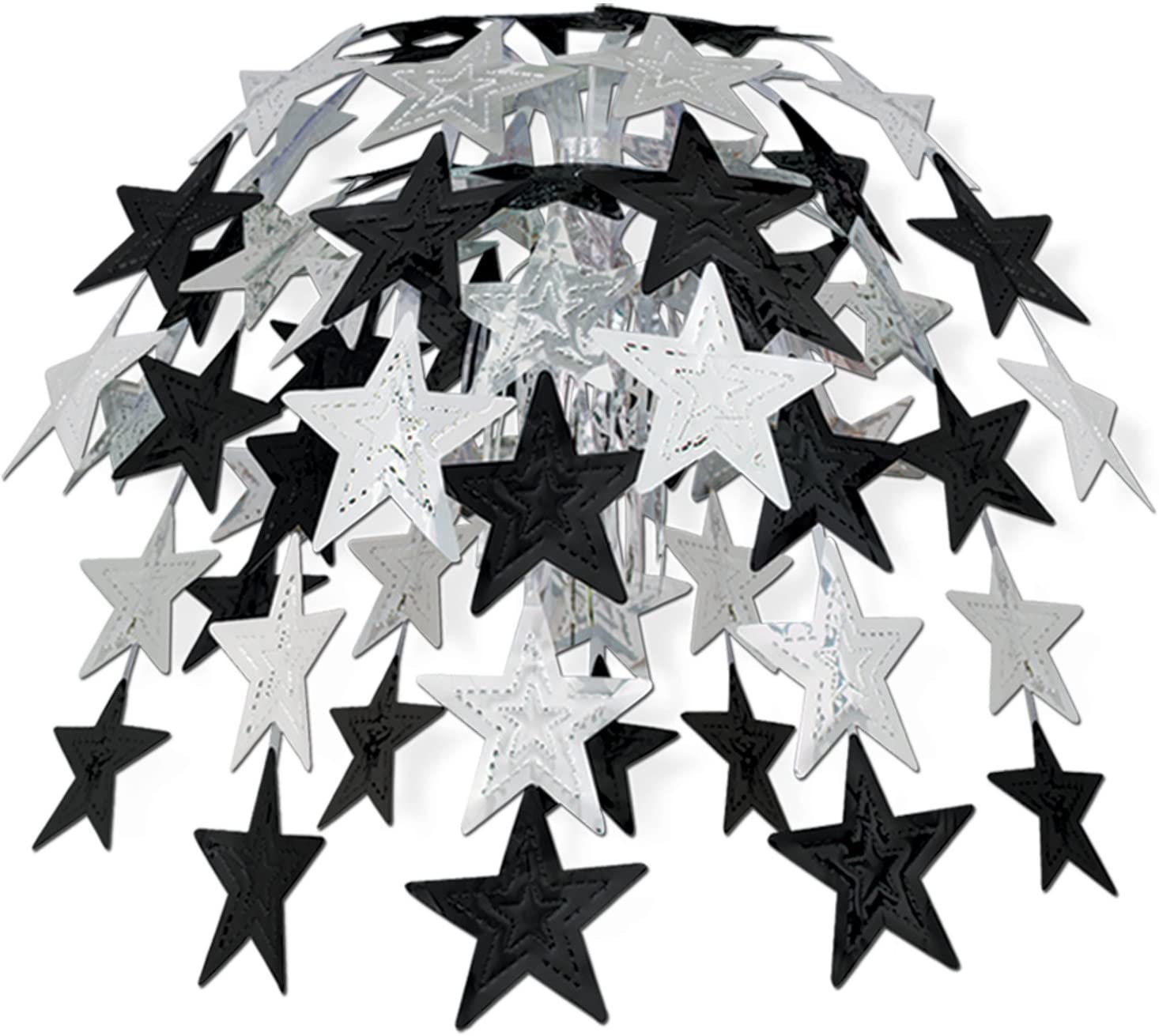Features cascading stars in different color variants. Available in gold, gold/black, and silver/black. Ready-to-hang.