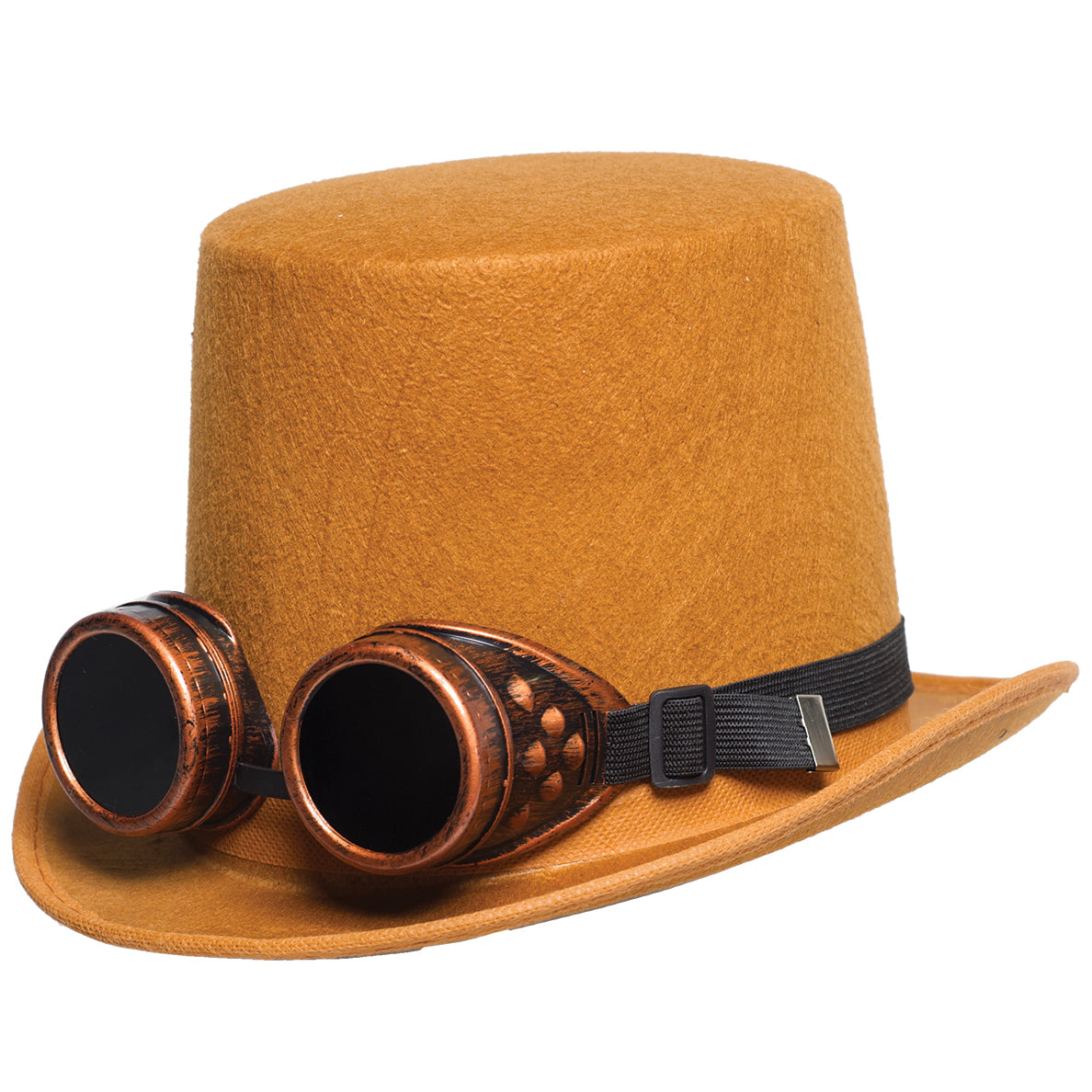 This item is a perfect addition to your steampunk costume! The faux suede hat has attached goggles that have lenses!