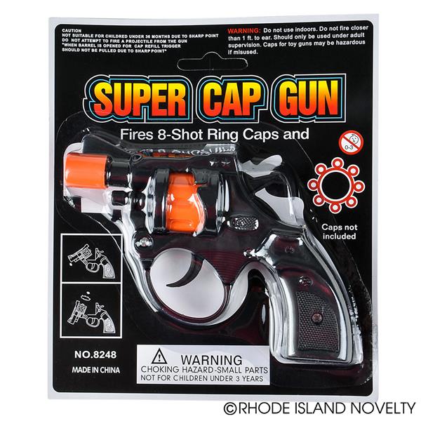 This 8 shot cap gun revolver works with single caps or round 8 shot caps.