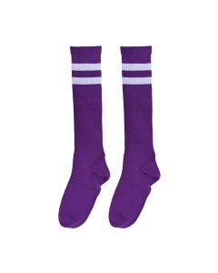 Retro-style knee-high athletic socks perfect for costume events, spirit wear, and stage performances. Each pair features bold contrasting stripes—white stripes on colored socks and black stripes on white—creating that classic athletic look. Available in multiple colors, these one-size-fits-most socks deliver nostalgic style for themed parties, costume contests, or any occasion calling for vintage flair. Comfortable and versatile costume hosiery that completes any retro ensemble.