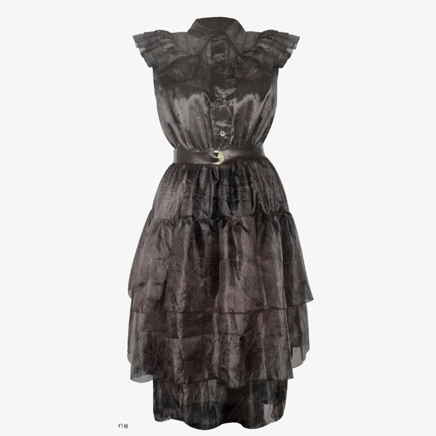Make your statement at the next party in our stylish Party Dress Adult Costume. The gothic-inspired black ruffled design will ensure you look your best no matter the occasion. You'll be sure to turn heads while you show off your bold style. Get ready to be the star of the night!