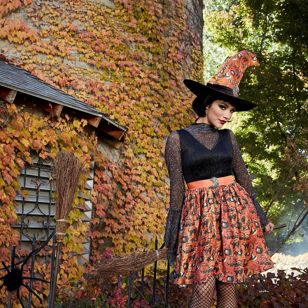 This adorable Vintage Witch Costume will be sure to be the hit of the party! Orange & Black, Vintage Print Full Short Skirt, Bell Sleeves, Dress & Matching Hat